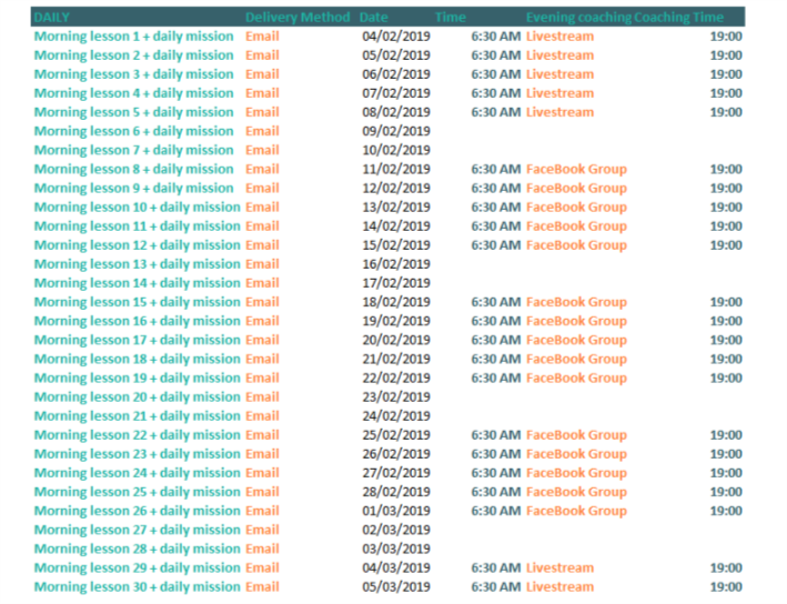 Each Morning you will receive an email with a link to a video training along with a MISSION for the day - you will need to POST #MissionNinjaAccomplished in the group DAILY once you have completed the task! The evening coaching will be a mix of webinar livestream and Facebook Q&A (same as the Daily Check Ins are run in the Trading Club)